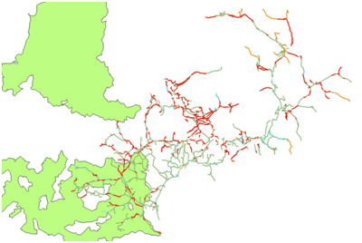 Nous avons récupérer trois différentes couches shapefile sur le site du gouvernement via data.gouv. Ces trois couches sont superposées dans l’ordre qui suit (brun, bleu, puis rouge) à partir du logiciel Qgis. Nous retrouvons dans un premier temps en brun le simple parcours des routes départementales. Sur la seconde slide, nous retrouvons en bleu le circuit de déneigement (qui recouvre la quasi-totalité du circuit routier). Enfin, sur la dernière, on observe en rouge les zones exposées à des risques en période hivernale (soi la moitié du trafic routier).