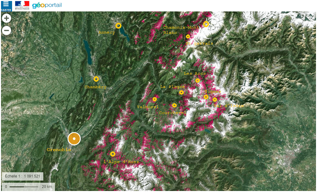 - Etude rapprochée : ce zoom en deuxième slide, permet de visualiser le lien entre l’étalement urbain, la hausse de la fréquentation touristique dans le domaine skiable et le zonage des zones à risque avec la mise en place de PPRN. Il est intéressant d’observer sur cette carte la façon dont le plan de prévision des risques naturels de Haute Savoie (jaune pâle) entoure parfaitement le chemin tracé par les regroupements urbains (en rouge vif). Le couvert urbain ressemble d’une certaine façon à des artères qui viennent se placer en fonction du parcours des reliefs. La zone orangée correspond au plan de prévention des avalanches aux alentours de Chamonix. La première remarque que nous pouvons nous faire sur cette zone est cette étonnante proximité entre zones urbaines, zones présentant un risque d’avalanches et domaine skiable (suivant cet ordre précis dans la région de Chamonix).