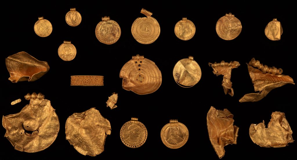 Tout d’abord, les médaillons sont datés de différents siècles. Lisbeth Imer, runologue pour le Musée National du Danemark, explique qu’ils ont été « utilisés sur une très longue période, et transmis sur des générations ». Les scientifiques ont identifié de grandes pièces romaines, représentant des empereurs du 4e siècle. La plus grande d’entre elles représente Constantin le Grand. Aux côtés de ces pièces ont été retrouvées des bractéates fabriquées en Scandinavie, à partir d’or, également romain. Les bractéates retrouvées auraient donc un lien évident avec l’Empire Romain d’Occident. Les gravures « imitent clairement celles que l’on retrouve sur certaines pièces romaines », notamment des représentations de visages à la manière des empereurs.
