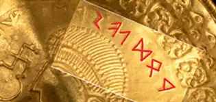 Runes identifiées (en rouge), inscrites sur la bractéate datée du 5e s. dans le trésor de Vindelev faisant mention du Dieu Odin. PHOTOGRAPHIE DE Michael Højlund