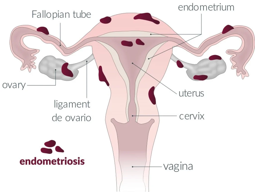 Les zones de migrations du tissu endométrial, qui tapisse normalement la cavité utérine, peuvent être nombreuses et plus ou moins étendues dans la cavité abdominale. Ces migrations provoquent des réactions inflammatoires chroniques très douloureuses, lesquelles impliquent des lésions internes. L’OMS définit 4 types de lésions. La première est qualifiée « d’endométriose superficielle », principalement localisée dans le péritoine pelvien. La deuxième, « l’endométriome » ou « kyste ovarien » est localisée dans les ovaires. Il y a ensuite « l’endométriose profonde », localisée dans le septum recto-vaginal, la vessie et le rectum. Enfin, dans de rares cas, l’endométriose peut migrer hors du bassin, jusque dans les poumons.