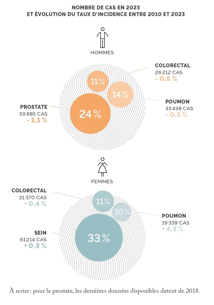 En France, on compte 433 136 nouveaux cas de cancers recensés en 2023, dont 57 % chez les hommes et 43 % chez les femmes. Le pronostic chez les hommes s’est amélioré ces dernières années, bien que le taux de mortalité reste le plus élevé. On constate en effet une diminution du nombre de cancers de la prostate, du poumon, ainsi que du colon. Chez la femme, on constate en revanche une augmentation très préoccupante du nombre de cas de cancers du poumon (+ 4,3 %) ainsi que du pancréas (+ 3,3 %), deux des cancers présentant les plus mauvais pronostics.